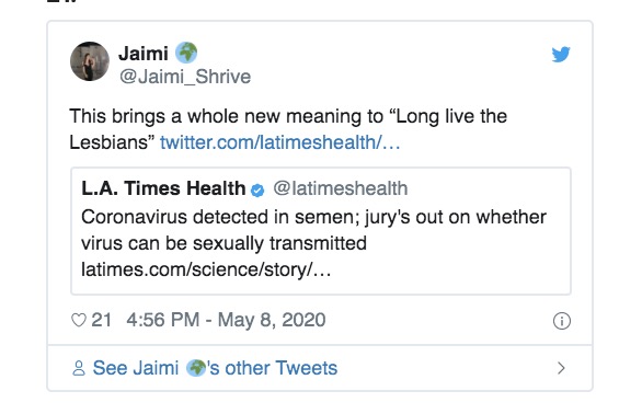Yep, according to Chinese researchers, the coronavirus “can persist in men’s semen even after they have begun to recover.” This finding raises the possibility the virus could be sexually transmitted.