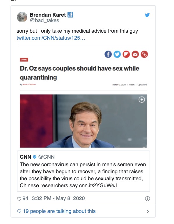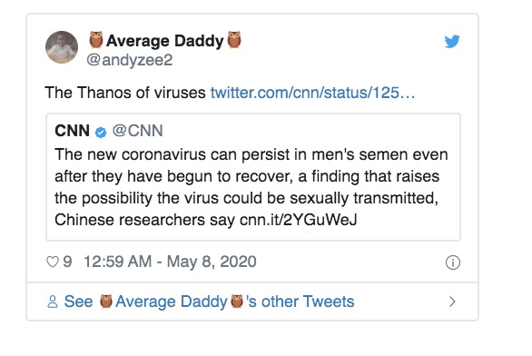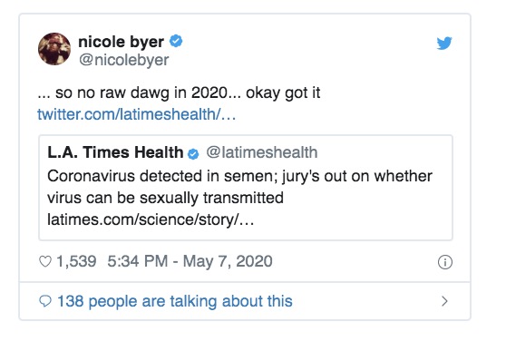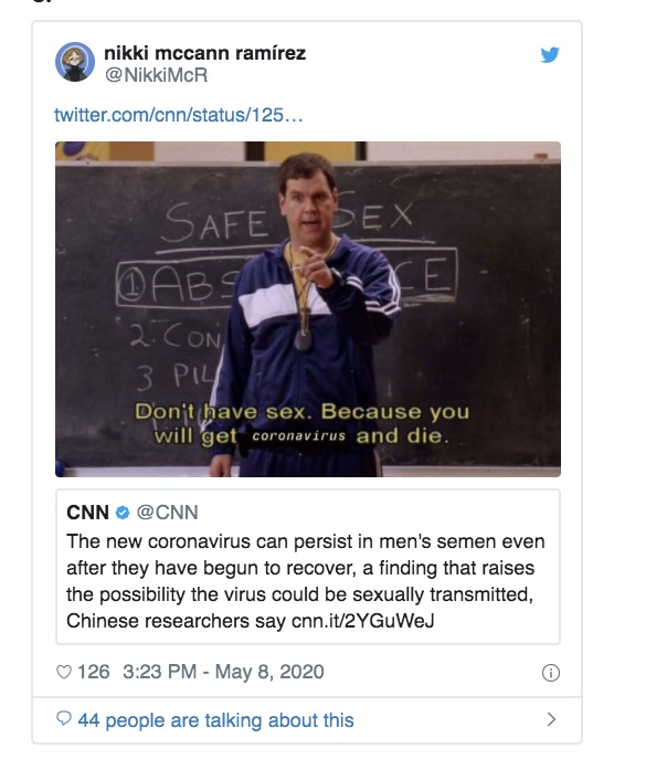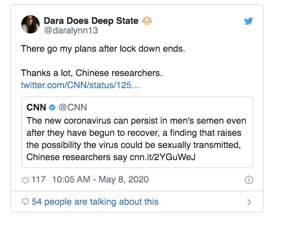 Yep, according to Chinese researchers, the coronavirus “can persist in men’s semen even after they have begun to recover.” This finding raises the possibility the virus could be sexually transmitted.
