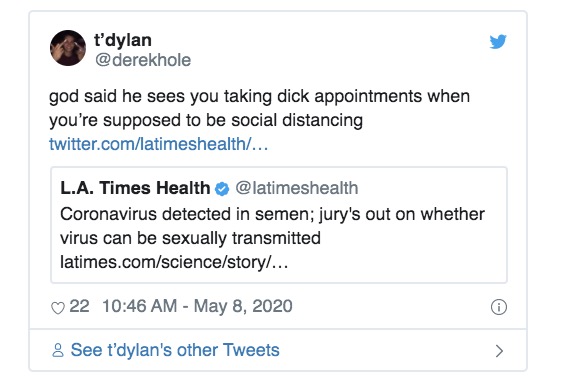 We know, we know! Another Coronavirus post. But for anyone out there considering throwing caution to the wind and hooking up with a stranger despite the lockdown, you’ll want to read this headline: