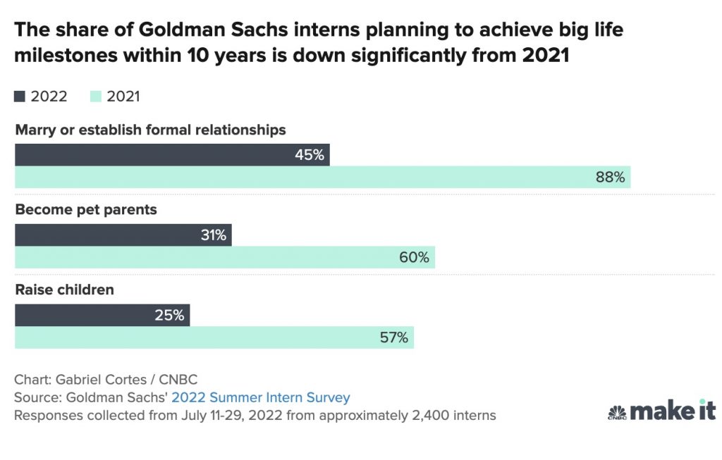 Some are reconsidering big life milestones, too: In 2021, 88% of Goldman Sachs interns said they expected to get married or establish a formal relationship in the next 10 years. Among the intern class of 2022, that expectation plummeted to just 45%.
