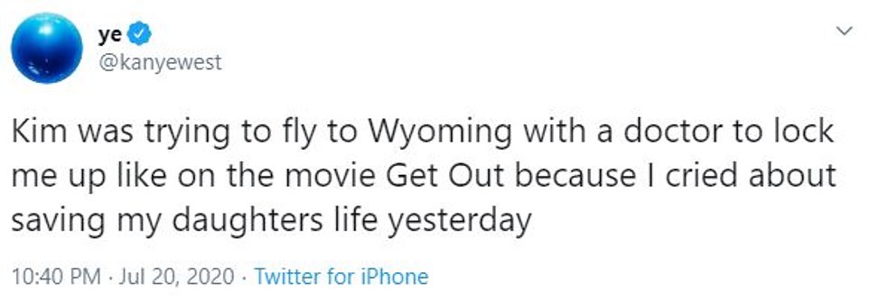 Kanye West went on a Twitter rant Monday night, claiming that wife Kim Kardashian West tried to ‘lock me up with a doctor’ following his presidential rally yesterday.’ In multiple posts the rapper lashed out at his wife and her mother Kris, and demanded they call him at his ranch in Wyoming. He also tweeted about Kardashian’s leaked sex tape with then-boyfriend Ray J in 2007 and the Playboy cover she did later that year. It came as sources said that Kardashian was considering divorcing Kanye if he didn’t drop his presidential campaign, after he told the world at a rally in South Carolina that the couple thought about aborting their eldest child, North.