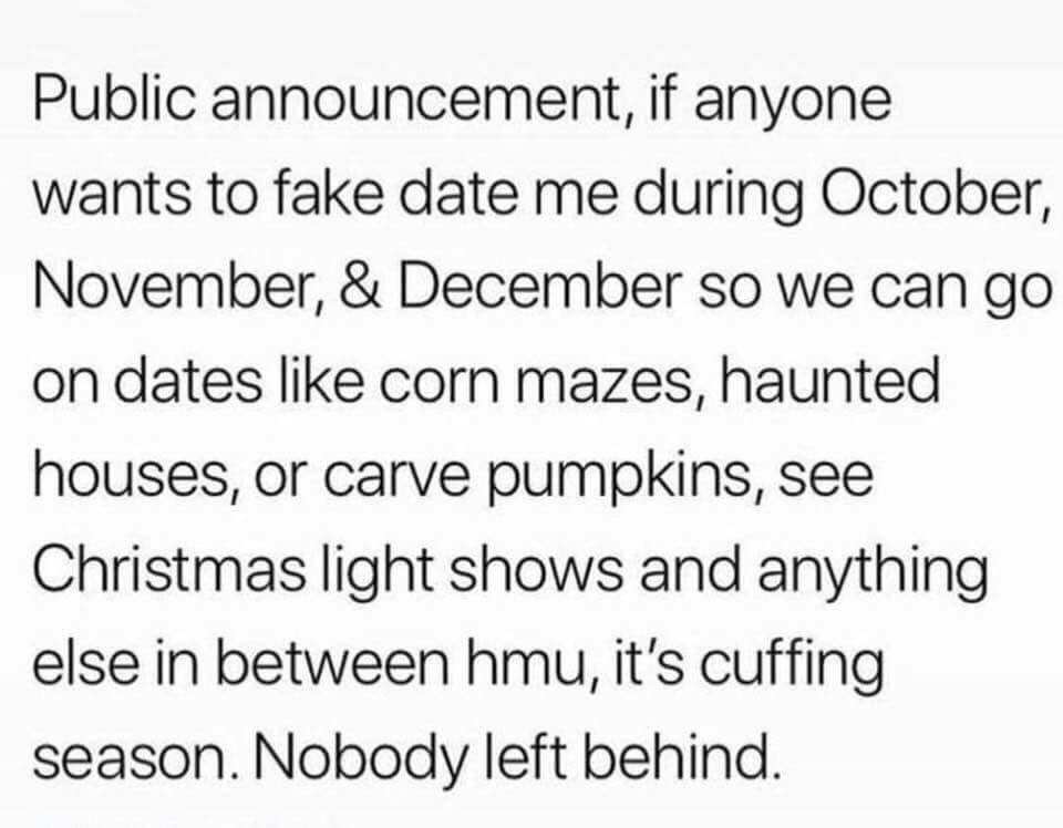 There’s a chill in the air and pumpkin spice lattes abound. You know what that means– it’s almost time for cuffing season. AKA the time of year people seem to pair up just so they have someone to cuddle with when it’s chilly out and because mistletoe kiss photos get extra likes on IG. But cuffing season is a flash in the pan… so here are some LOL memes to get you through.