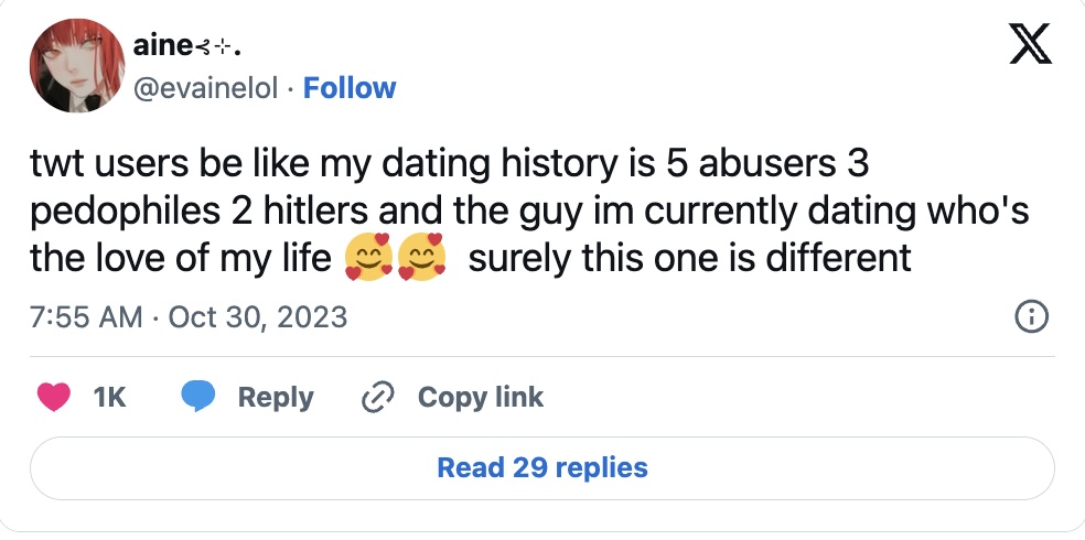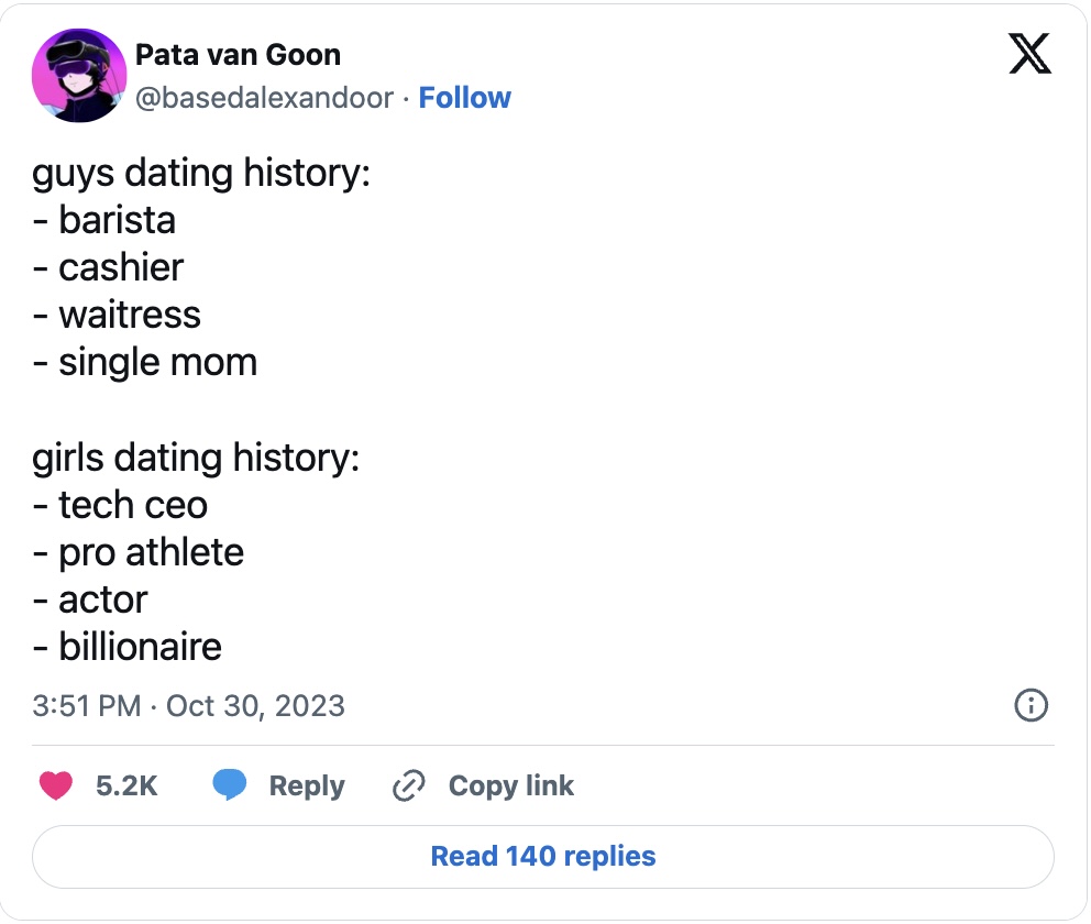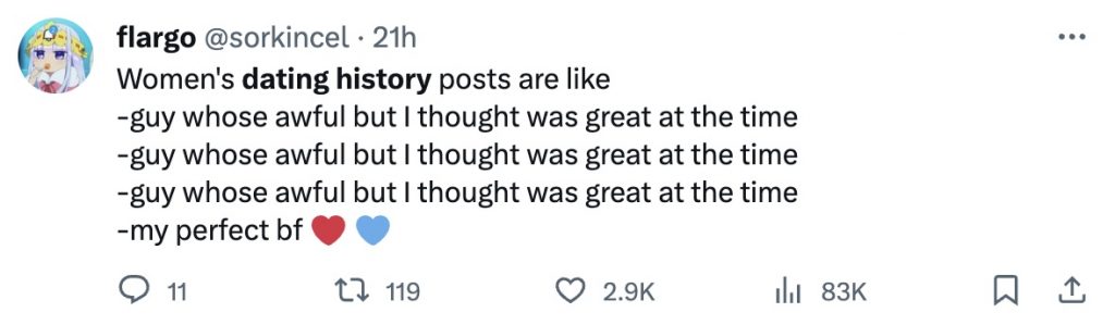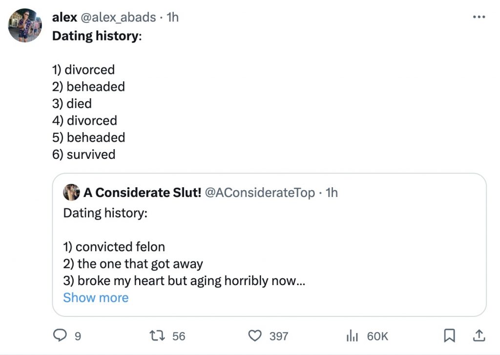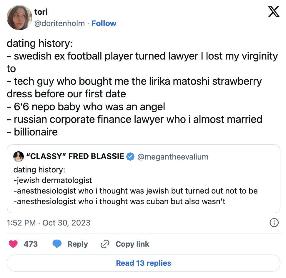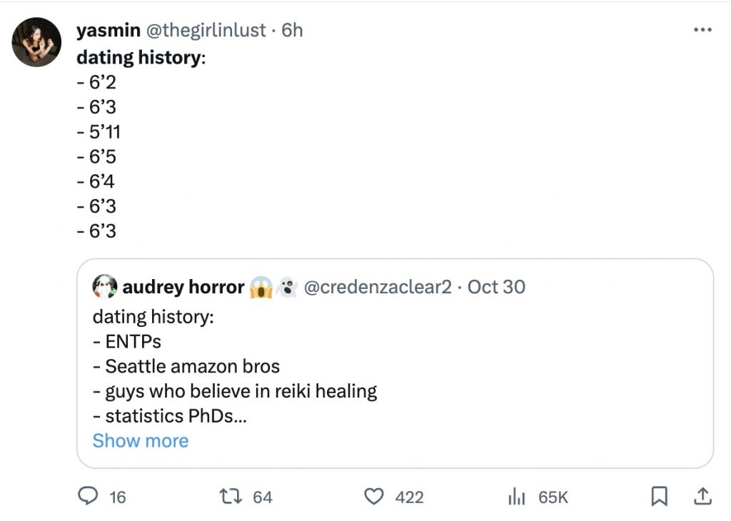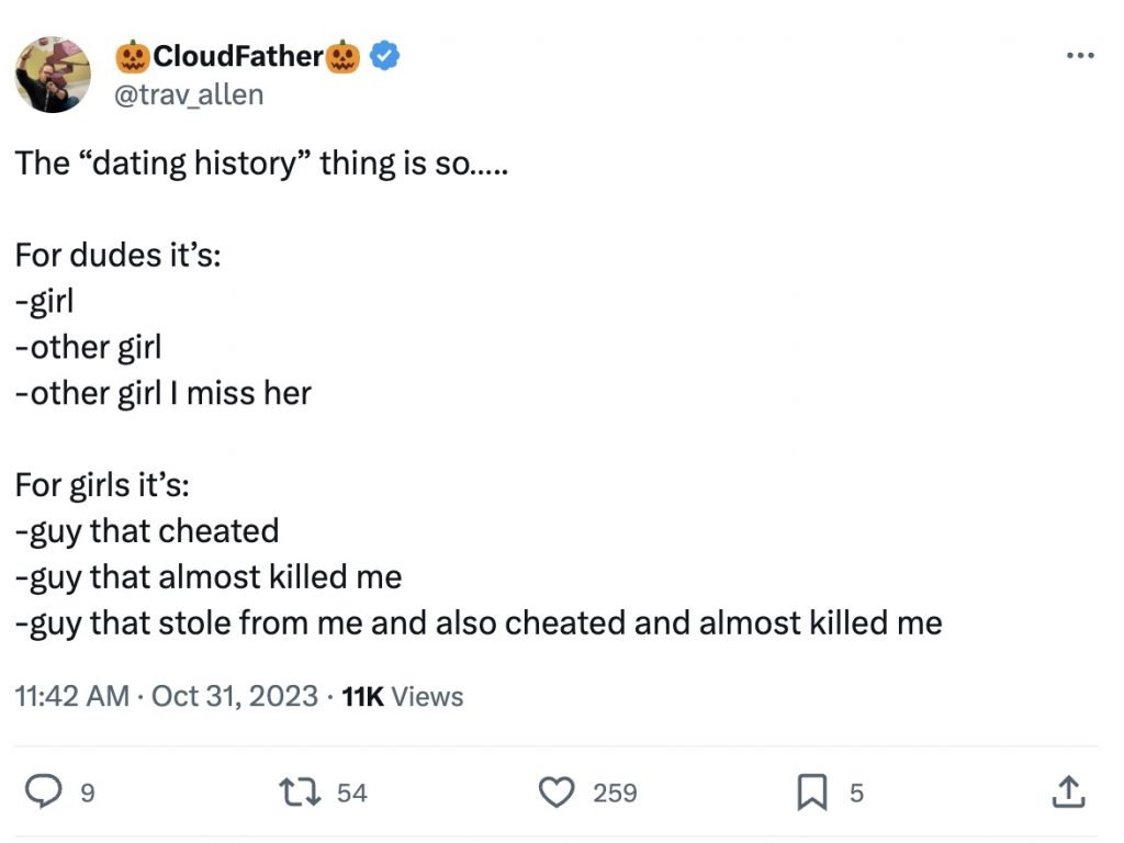 Over on Twitter (or X, whatever), people started sharing their dating history as a list, and it was pretty hilarious what some people had to say. The general consensus is women have much more exciting pasts.