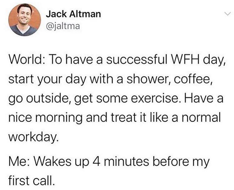 If you, like so many, are coming on nearly a month of working from home, you’re probably coming into a new normal, a sweatpants, rolling out of bed, working from the couch normal. And if you are, then you feel these memes SO hard. Happy Friday, whatever that means anymore!